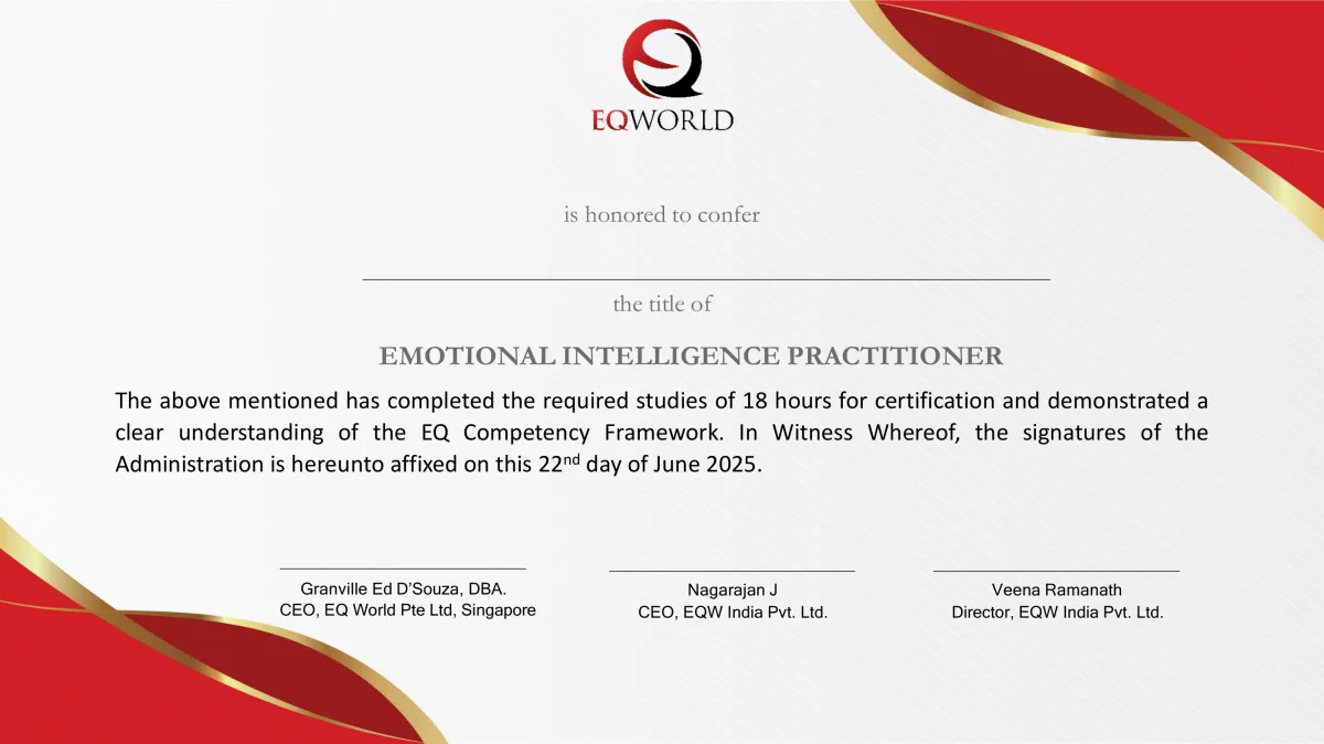 “What a wonderful learning experience with EQ World India! I had a great time meeting everyone at the training. It was great to meet you again, Granville D’Souza, DBA, and an absolute delight to connect with Nagarajan J and Veena Ramanath—thank you for sharing your rich experiences and insights! I truly loved our cohort, where we all immersed ourselves in each other's stories and connected on a deeper level. A big thank you for everything we experienced together!”
